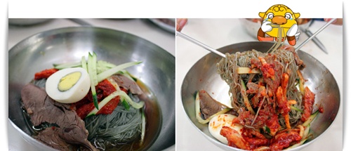 在炎炎夏日, 冷麵的人氣急升, 每家冷麵店門前排隊等待座位的客人多不勝數, 這也是韓國夏天的獨特「風景」。店員會為坐下來的客人送上熱熱的肉湯。喝完美味的肉湯後, 冷麵正式登場。來到咸興冷麵店, 推薦大家點拌冷麵。吃著咸興冷麵時感到辛辣, 可以喝一口熱肉湯! 肉湯的成份有助減低辛辣感。