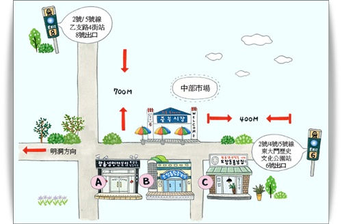 2號線/4號線/5號線東大門歷史文化公園站6號出口, 直行大概400米就可以看到咸興冷麵店。