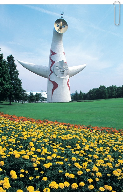 太陽塔,高高聳立。這是1970年日本舉辦万國博覽會時,岡本太郎專為万博會設計的一個主題作品。圍繞著太陽塔